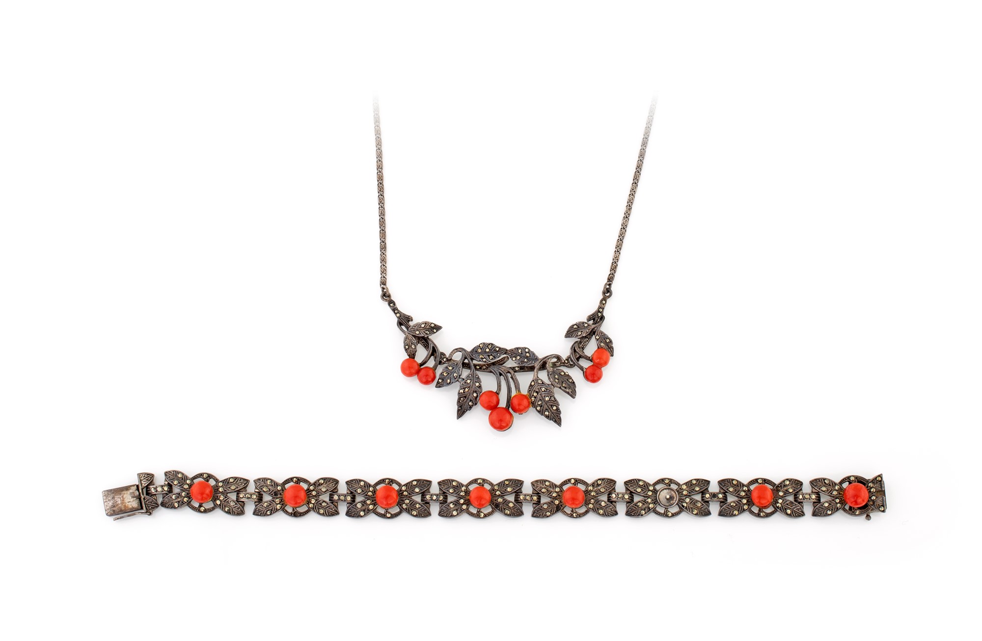 ANTICA DEMI PARURE - realizzata in argento di girocollo e bracciale, con motivi di foglie di ciliegio e coralli rosso intenso. Un corallo è mancante. Anno 1930 circa.