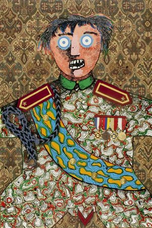 Enrico Baj Lo stratega militare Sahuguet d'Amarzit, 1971 serigrafia a colori e collage su broccato,tiratura in 300 esemplari, cm. 90x60 Bibliografia: "multipli di Baj-Donazione dell'artista",Castello Sforzesco,Milano,1976 n. 27