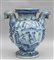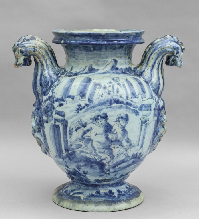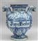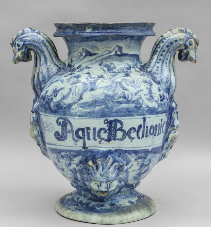 Grande idria in ceramica decorazione bianca e blu su fondo bianco prese a forma di grifoni al centro mascherone scritta 'Aque bechonic' marca Lanterna Savona sec.XVII