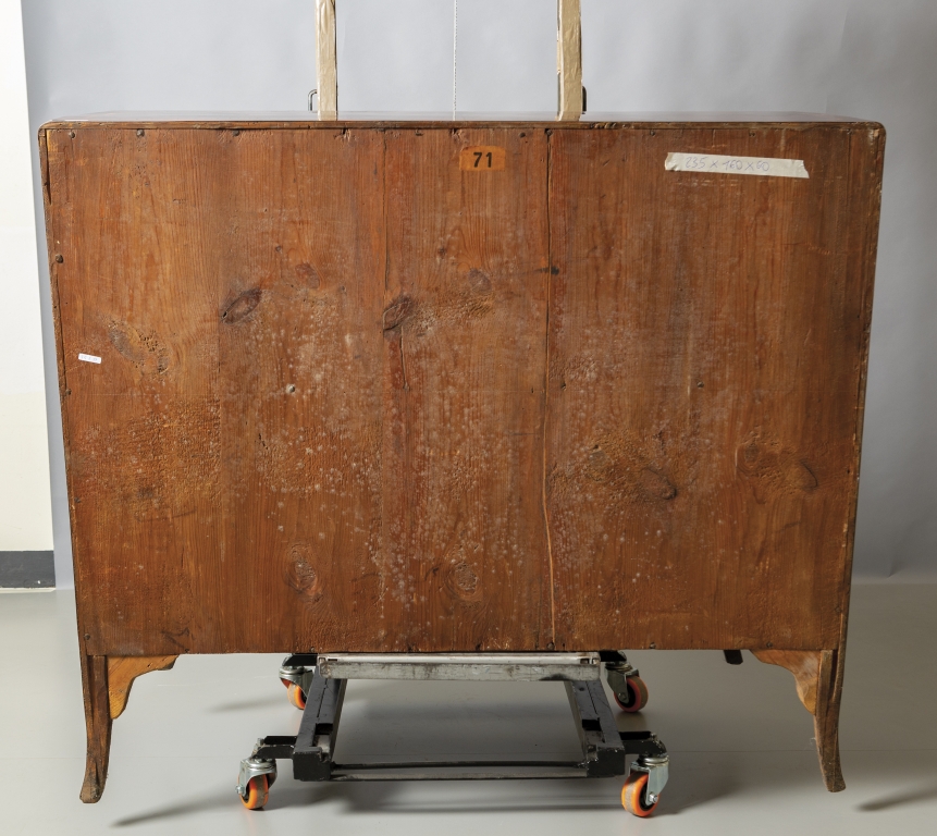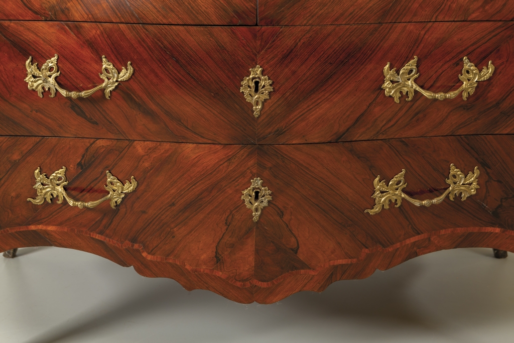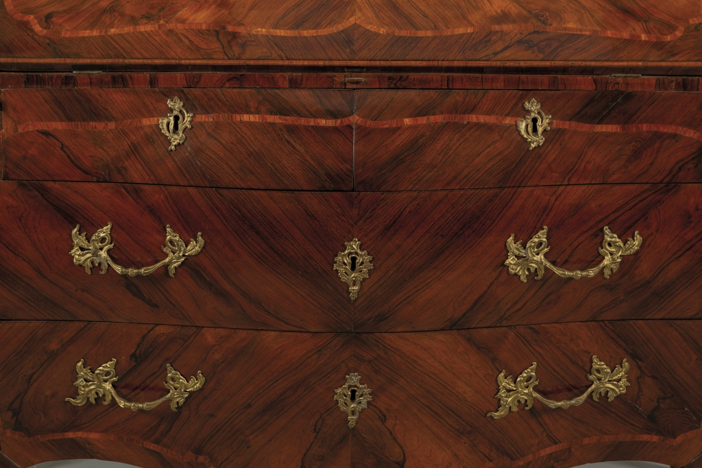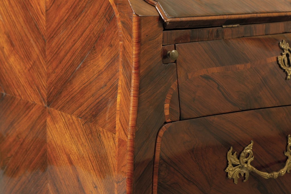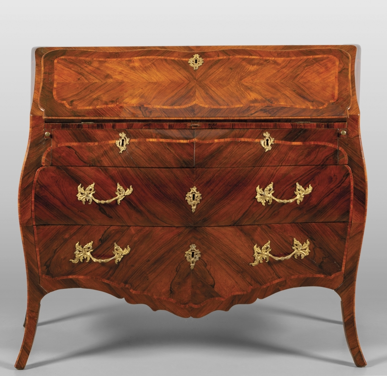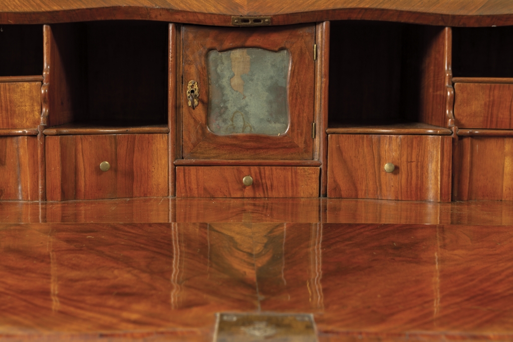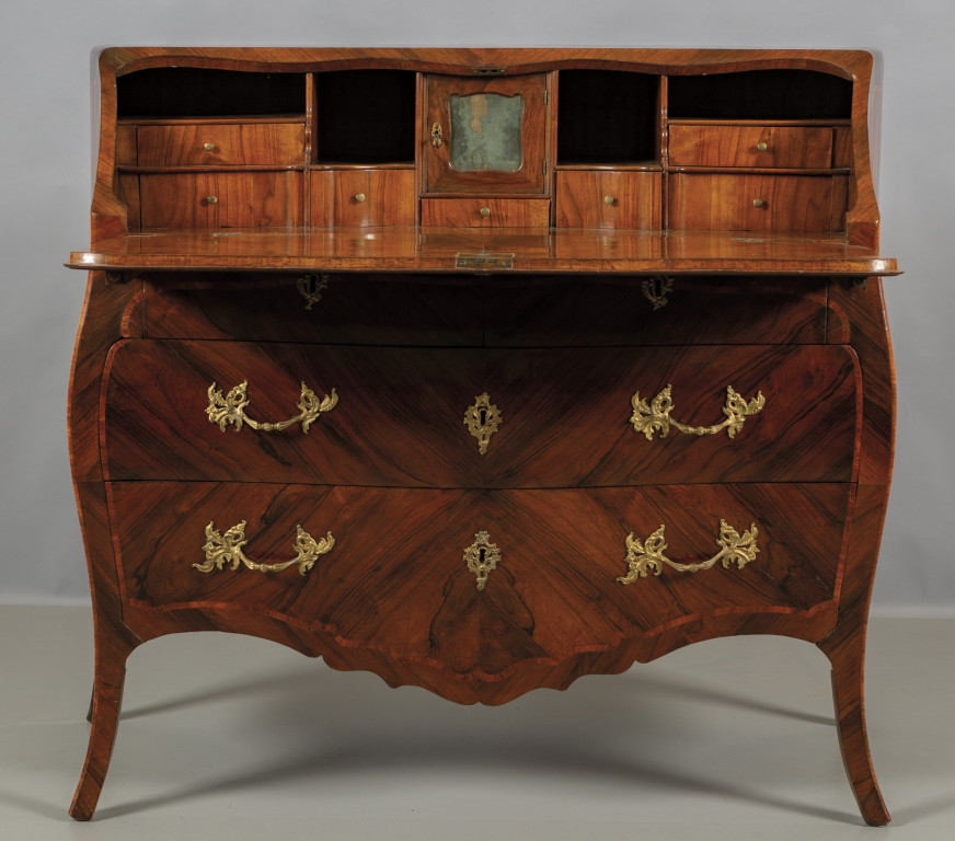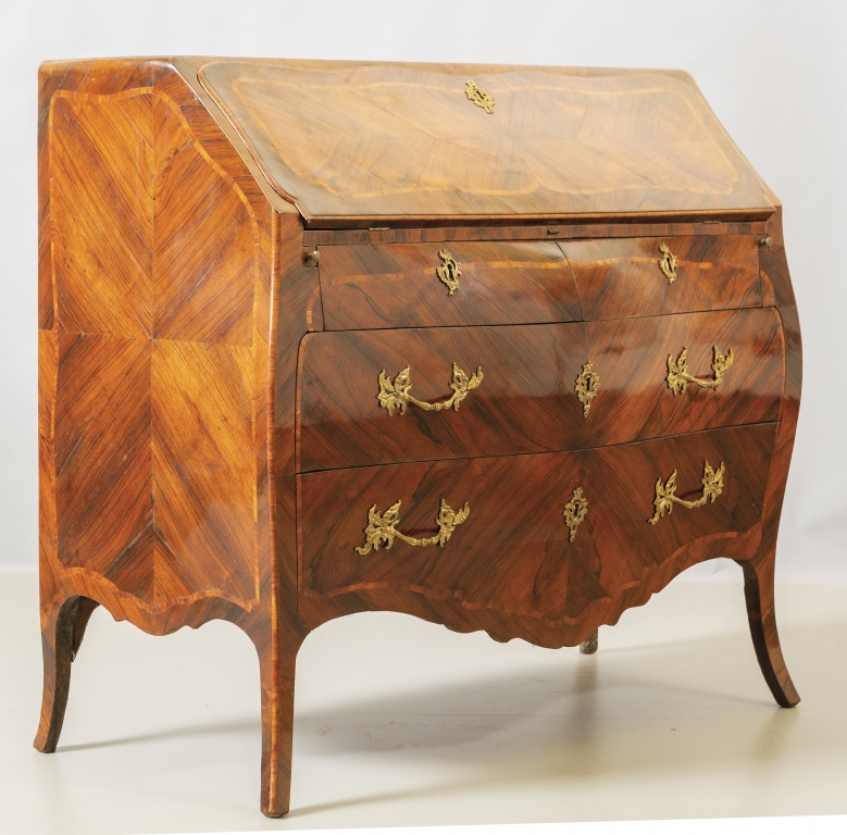 Ribalta Luigi XV lastronata in palissandro e filettata in bois de rose movimentata sul fronte e sui fianchi sul fronte ribalta che cela all'interno scarabattolo con sportello e numerosi cassetti Genova metà sec.XVIII