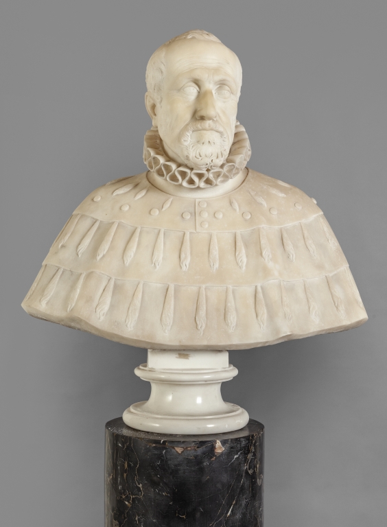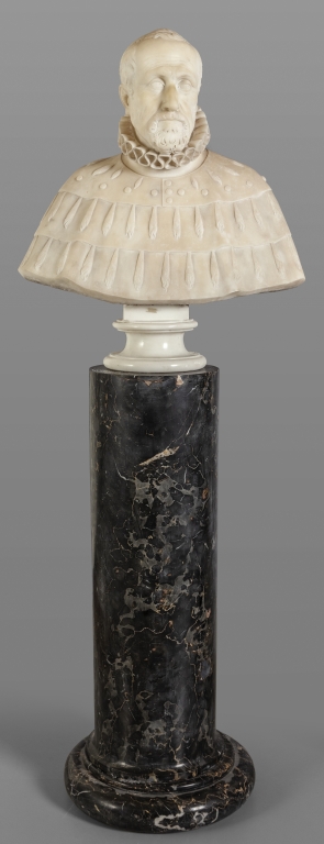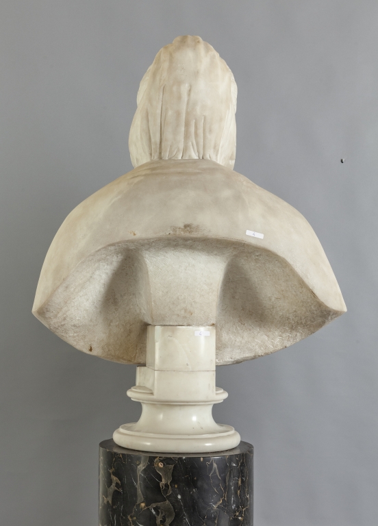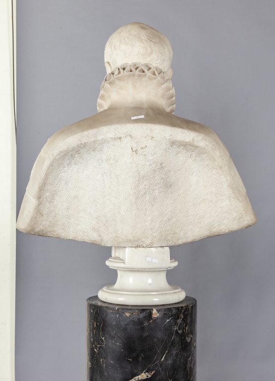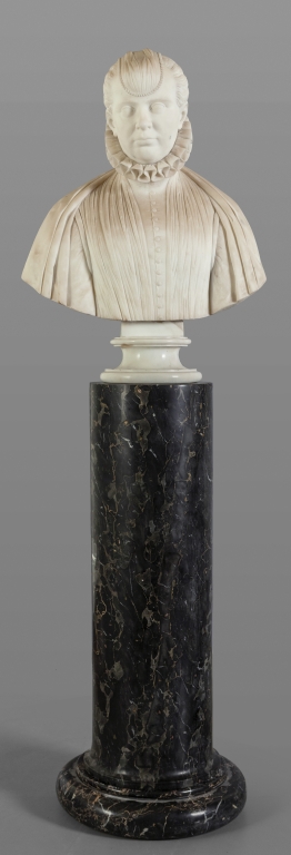 'Gentiluomo con ermellino' e 'Gentildonna con cuffietta' coppia di importanti busti in marmo bianco statuario poggianti su basi in marmo portoro con basamenti in marmo bianco Genova sec.XIX