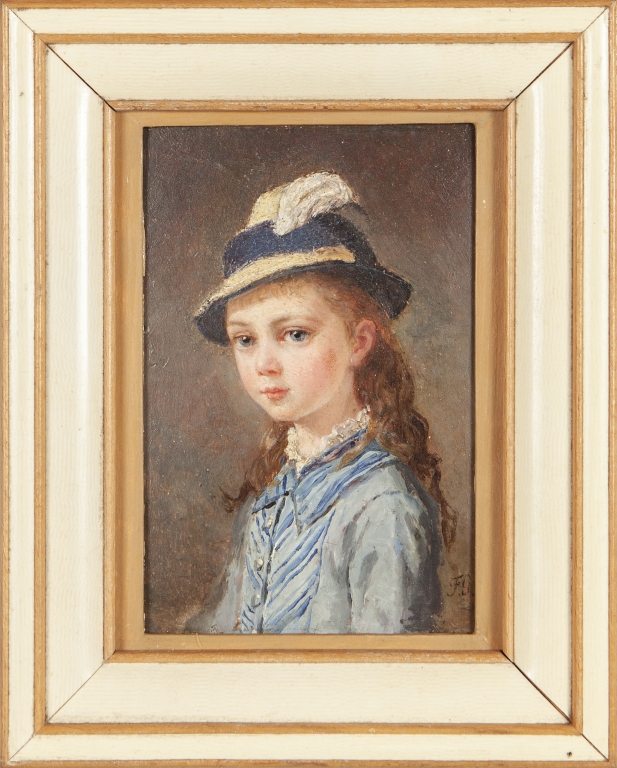 'Ritratto di bimba con cappellino blu' olio su tavoletta s.to in b.a ds.