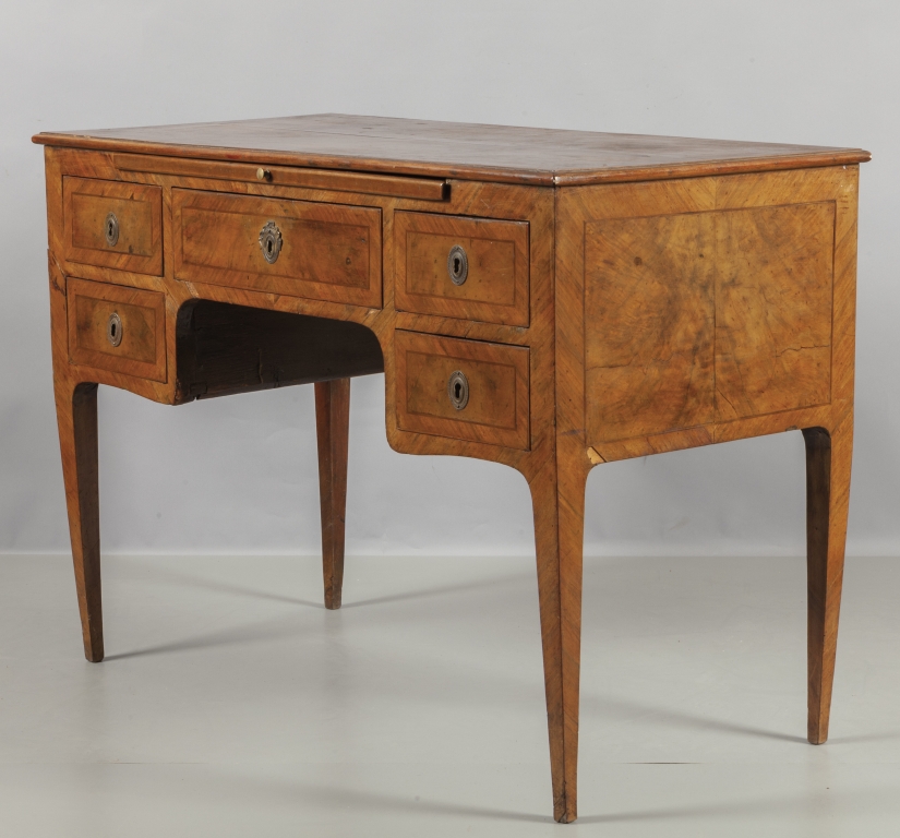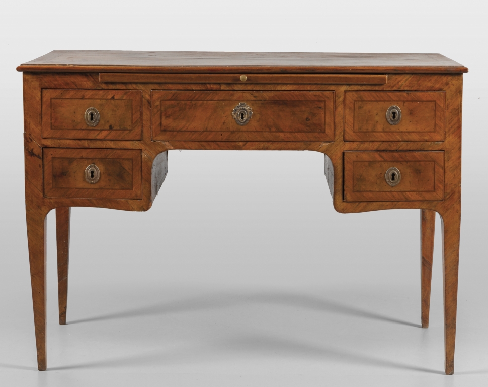 Scrivania Luigi XVI lastronata in noce e filettata in palissandro cinque cassetti nella fascia piano estraibile Lombardia fine sec.XVIII