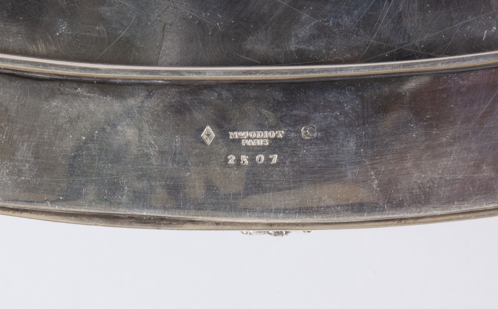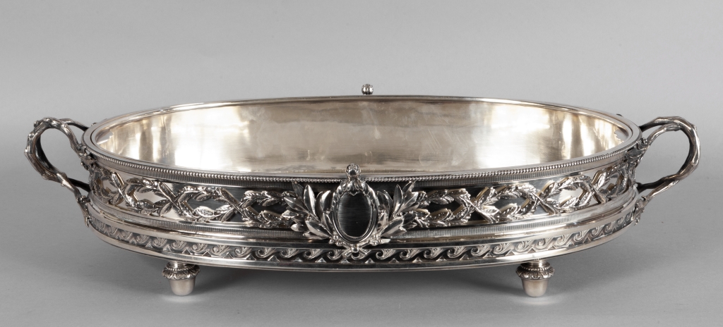 Centrotavola in argento trasforato con manici decorato con tralci e foglie parte centrale estraibile in metallo argentato Maison Odiot fine sec.XIX