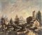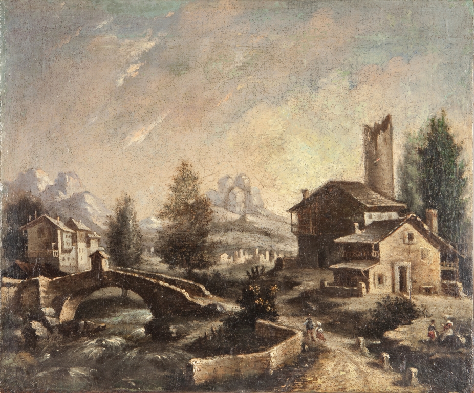 Scuola italiana sec.XVIII 'Paesaggio con fiume e personaggi' olio