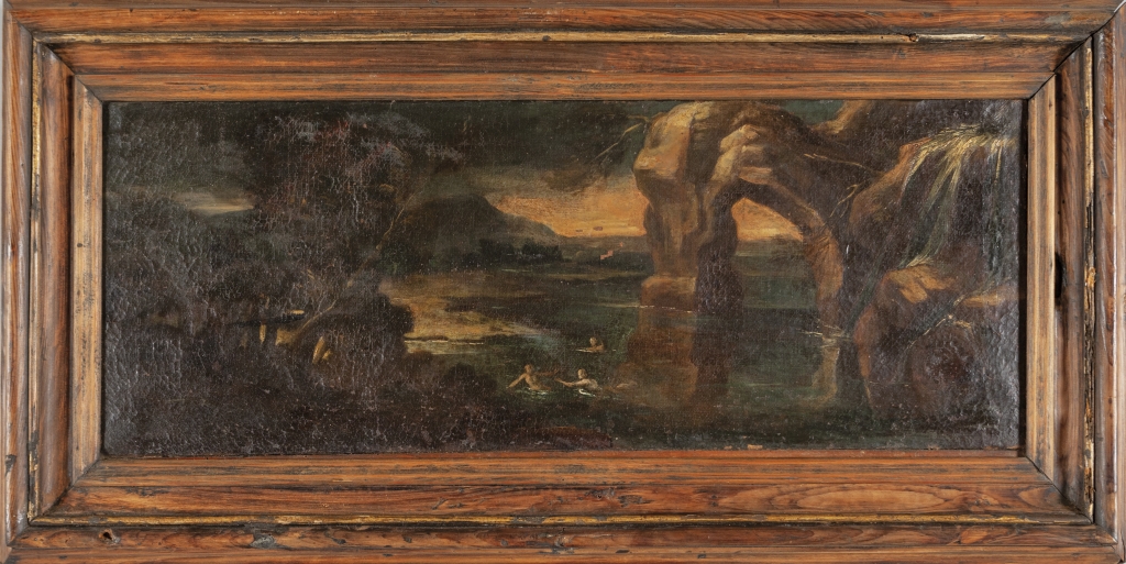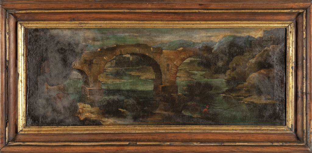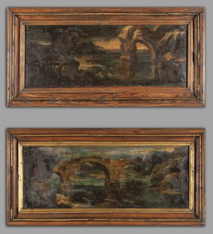 Scuola veneta sec.XVIII 'Paesaggi fluviali con personaggi' coppia di olii