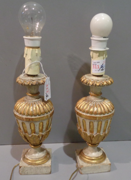 Coppia di candelieri Luigi XVI in legno intagliato e dorato adattati a lampada sec.XVIII