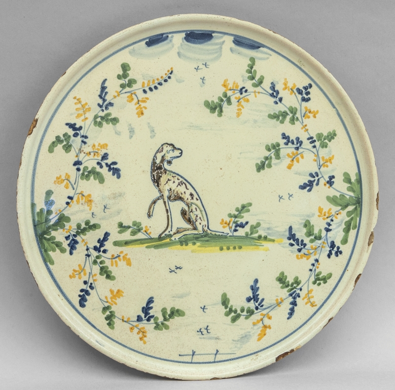 Alzata in ceramica di forma rotonda decorata in policromia su fondo bianco al centro cane da caccia Pavia sec.XVIII
