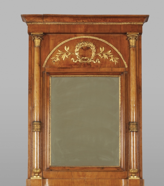 Specchiera Impero lastronata in noce montanti con mezze colonne ricca decorazione in legno intagliato e dorato sec.XIX