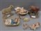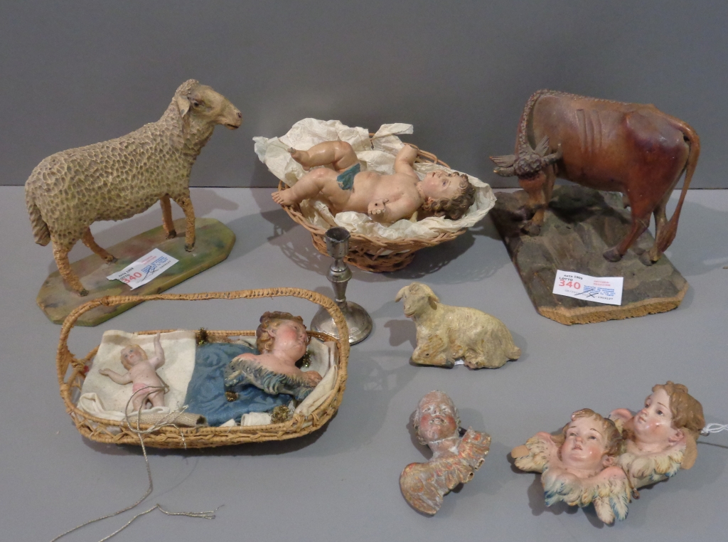 Scatola contenente oggetti da Presepe napoletani tra cui una mucca in legno intagliato e dorato e alcune testine d'angelo in terracotta policroma e legno