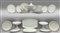 Servizio di piatti in porcellana bianca decorato nel bordo in rosso e oro composto da: 32 piatti piani 18 piccoli 11 fondi zuppiera salsiera coppia di alzate 2 raviere insalatiera piatto da portata rotondo e 3 piatti da portata rettangolari