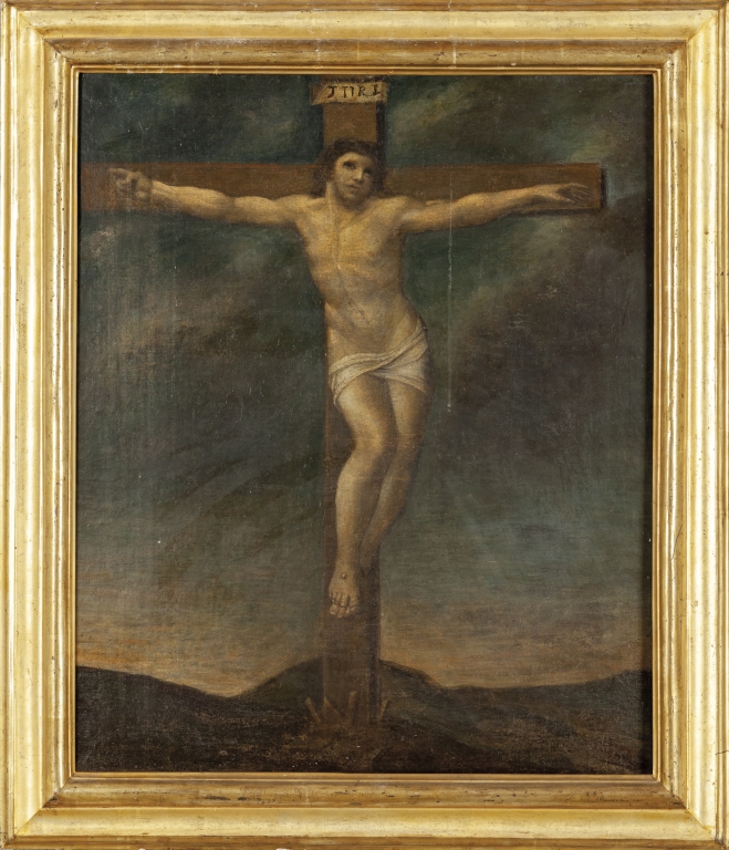 Scuola genovese sec.XVII 'Cristo in Croce' olio cornice coeva in legno intagliato e dorato