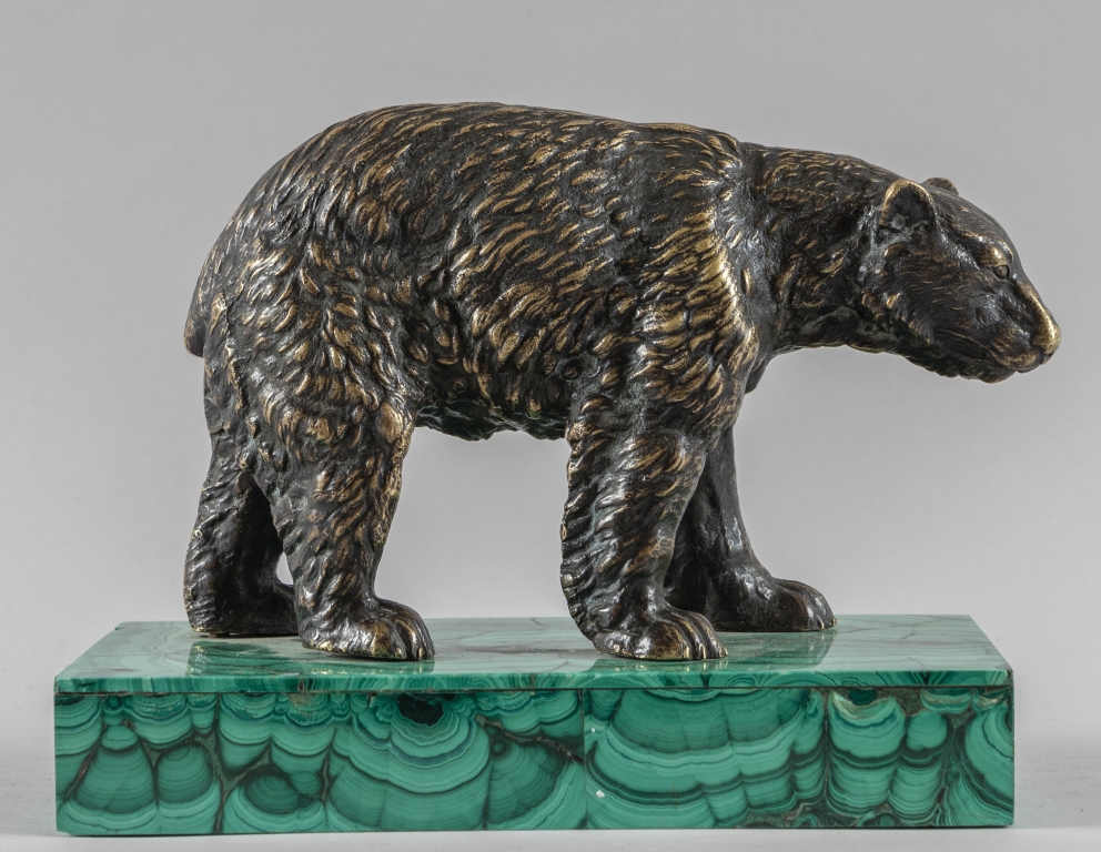 Orso scultura in bronzo montata su base lastronata in malachite Russia inizi sec. XX
