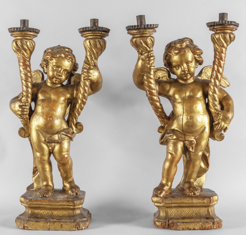 Coppia di angioletti portacero in legno intagliato e dorato Piemonte sec.XVIII
