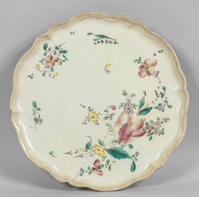 Alzata in maiolica a fondo bianco con fiori marca A.Levantino Savona sec.XVIII