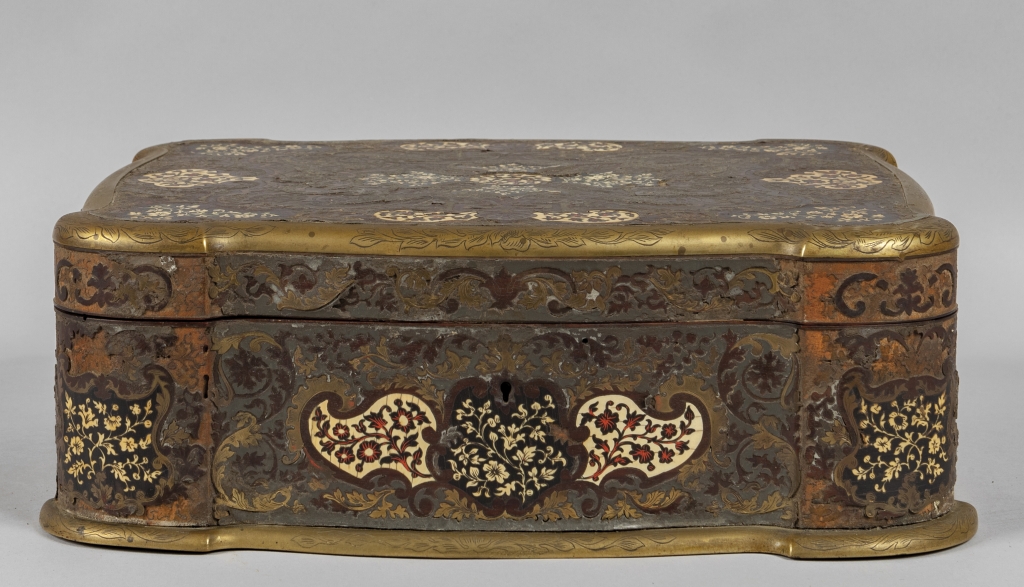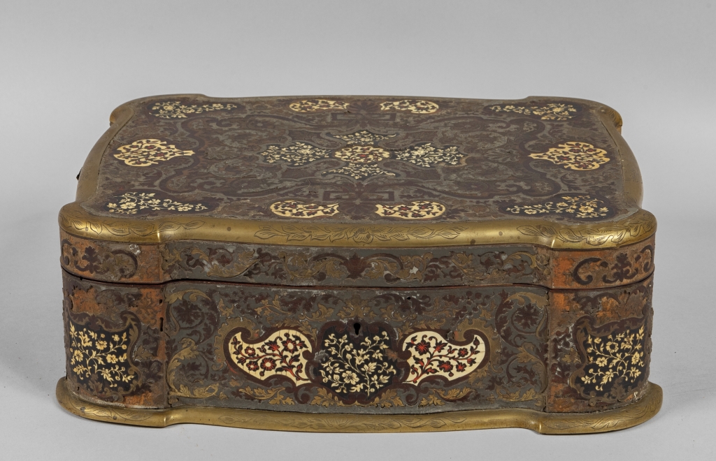 Scatola in stile boulle lastronata ed intarsiata in materiali diversi Francia sec.XIX