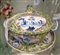 Tazza da puerpera in ceramica policroma decorata con riserve e paesaggi su fondo verde