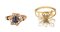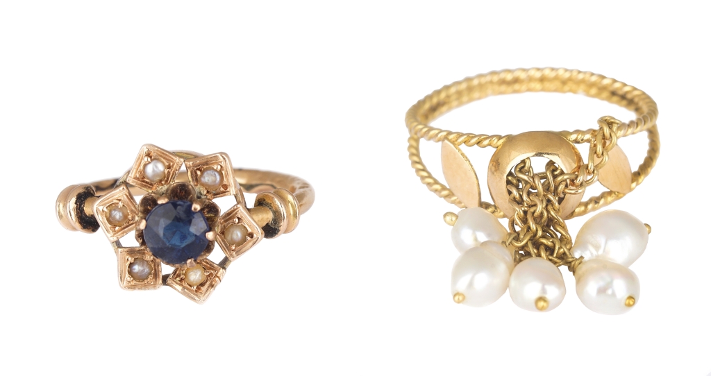 Lotto composto da tre anelli di cui uno in oro giallo e rosa con microperla e zaffiro di sintesi uno con perle d'acqua dolce ed uno a forma di fiore con montate micro turchesi