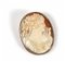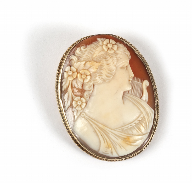 Spilla in oro giallo portante cammeo raffigurante profilo con giovane fanciulla ed lira