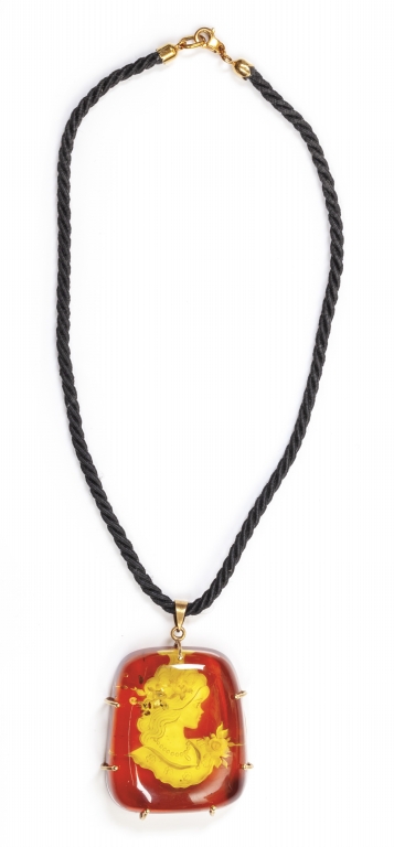 Cordone portante ciondolo in ambra con incisione a profilo femminile trattenuto da montatura in oro giallo