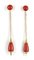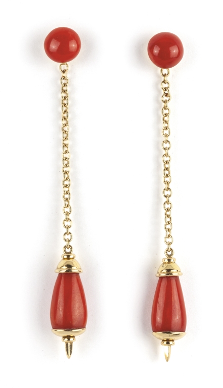 Orecchini in oro giallo di forma pendente con montati quattro coralli di colore rosso