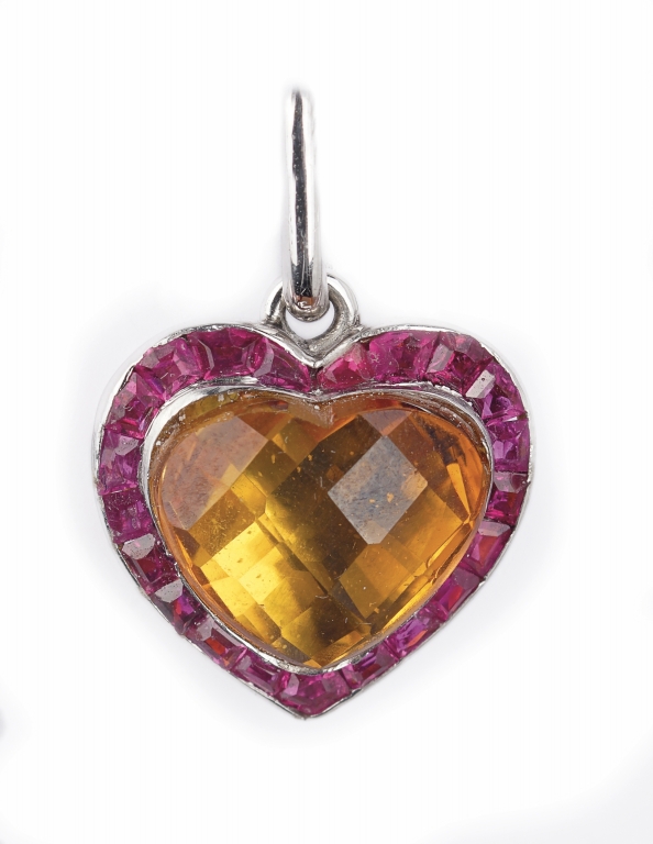 Ciondolo in oro bianco a forma di cuore con incastonato un topazio taglio a cuore briolette e rubini naturali a contorno taglio calibrato