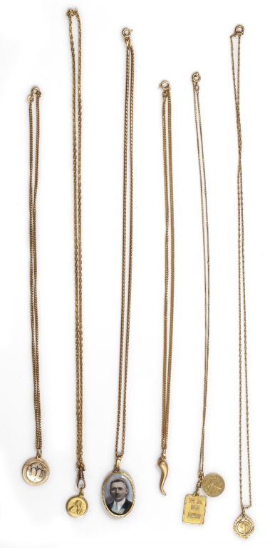 Lotto composto da sei catenine in oro giallo e sette ciondoli di diverse forme e misure