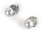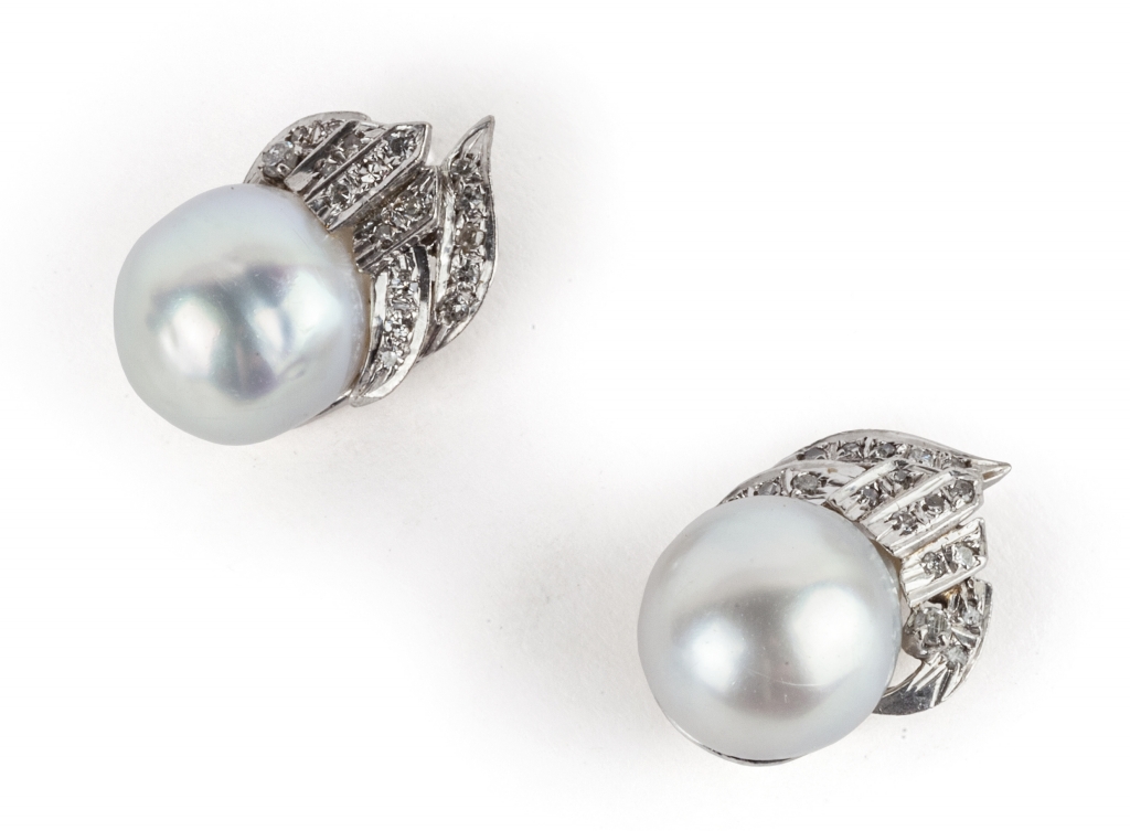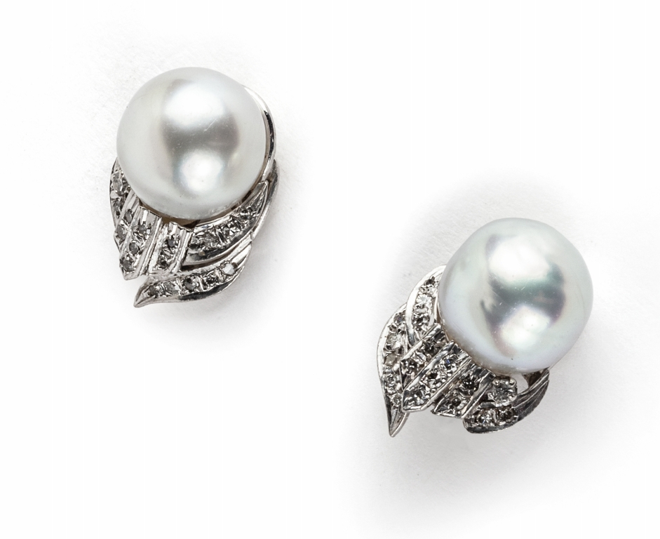 Orecchini in oro bianco con montate due perle coltivate di mm 11 e piccoli diamanti taglio brillante a contorno