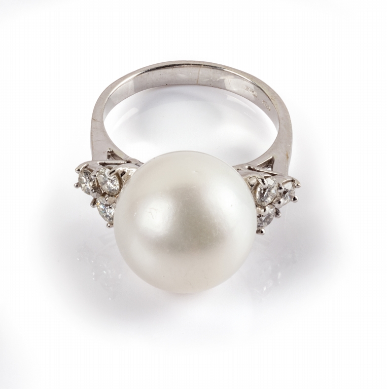 Anello in oro bianco con montata una perla bianca australiana coltivata di mm 15 diamanti taglio brillante a contorno per tot ct 0 70 circa