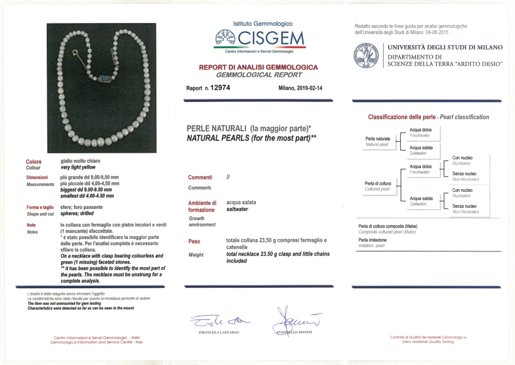 Filo composto da settantasette perle naturali di misura degradè da mm 4 a 9 con chiusura in oro rosa ed argento con incastonati piccoli smeraldi e piccoli diamanti