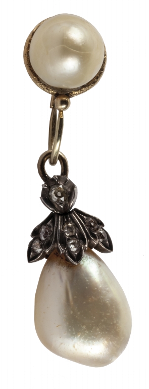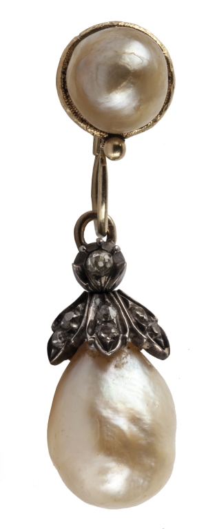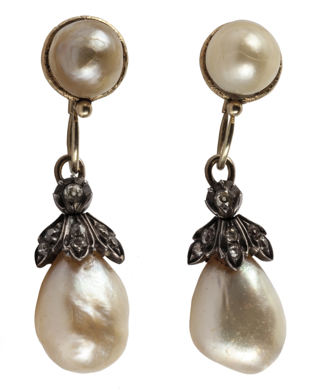 Orecchini in oro giallo ed argento epoca primi '800 con montate quattro perle naturali di cui due rotonde di mm 10 e due a pera di mm 12 x 18 nella parte di supporto alle due perle pendenti sono incastonati su motivi floreali dei piccoli diamanti vecchio taglio