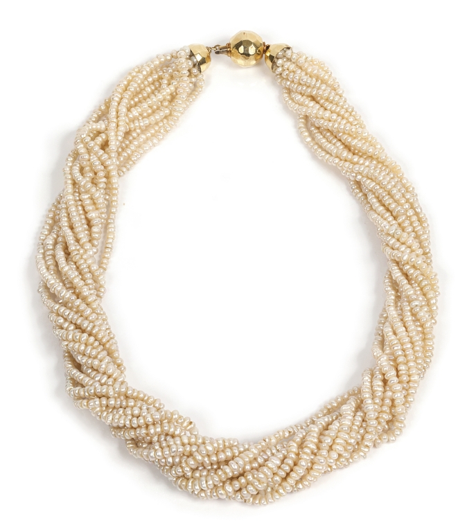 Torsade composta da dodici fili di micro perle di acqua dolce e chiusura in oro giallo