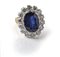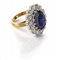 Importante anello in oro bianco e giallo con incastonato uno zaffiro naturale taglio ovale di ct 8 00 circa e quattordici diamanti taglio brillante a contorno per tot ct 3 30 circa