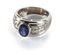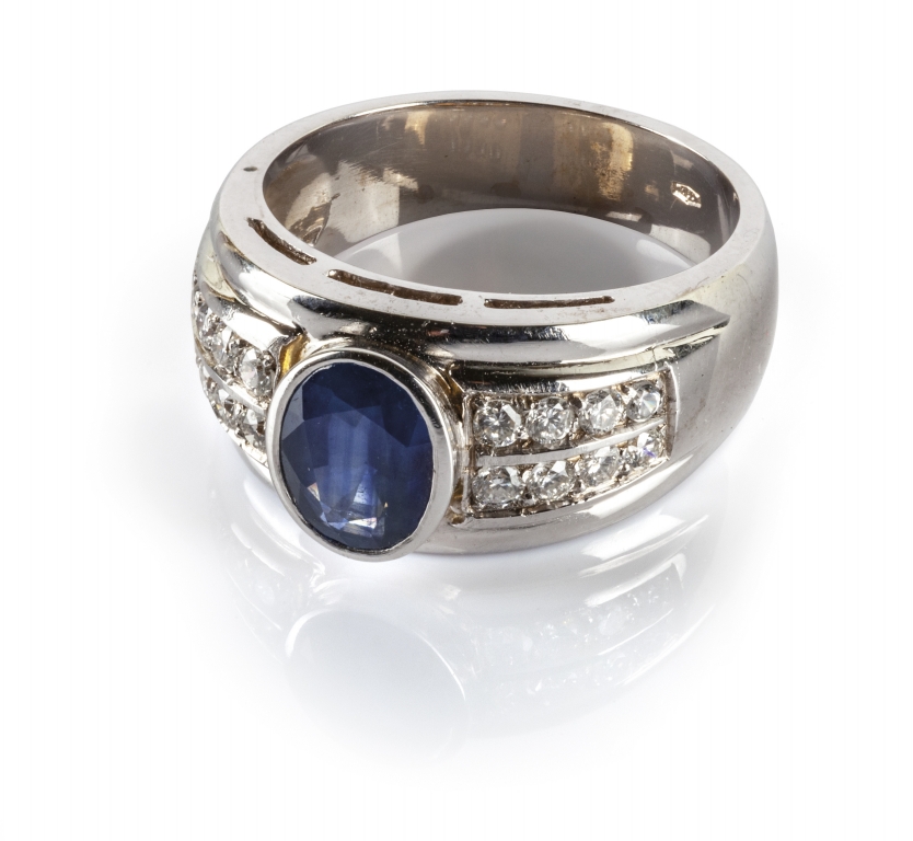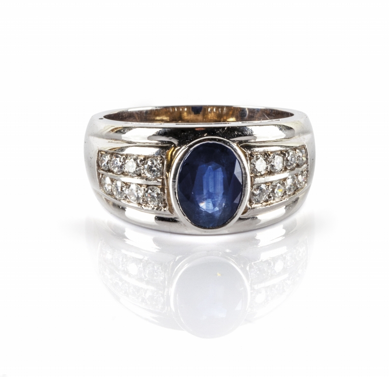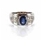 Anello in oro bianco a forma di fascia con incastonato zaffiro ovale di ct 1 50 circa e brillanti laterali