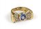 Anello in oro giallo a forma di fiocco con incastonato uno zaffiro naturale taglio ovale di ct 3 00 circa e piccoli brillanti a contorno per tot ct 0 30 circa