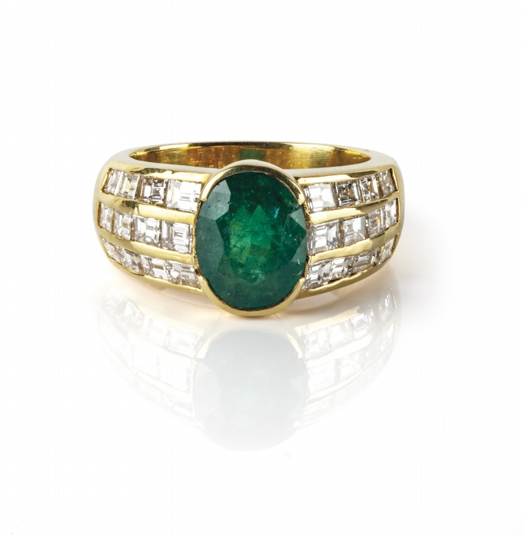 Anello in oro giallo a forma di fascia con incastonato uno smeraldo taglio ovale di ct 2 50 circa e diamanti taglio carrè per tot ct 1 50 circa