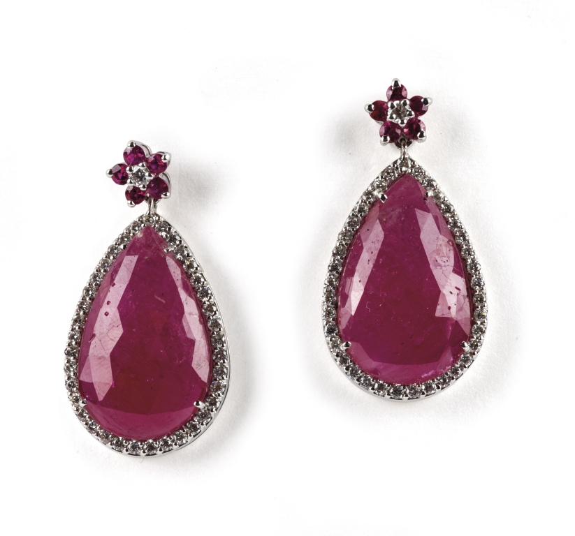 Orecchini in oro rosa sulla quale sono montate due radici di rubino taglio briolette di ct 23 06 circa e brillanti naturali taglio brillante per tot ct 1 01 circa
