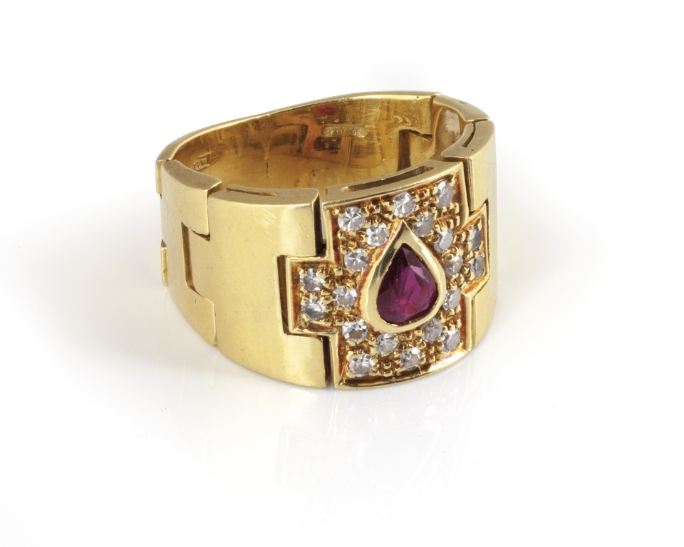 Anello in oro giallo con incastonati piccoli brillanti ed un rubino taglio goccia di ct 0 70 circa