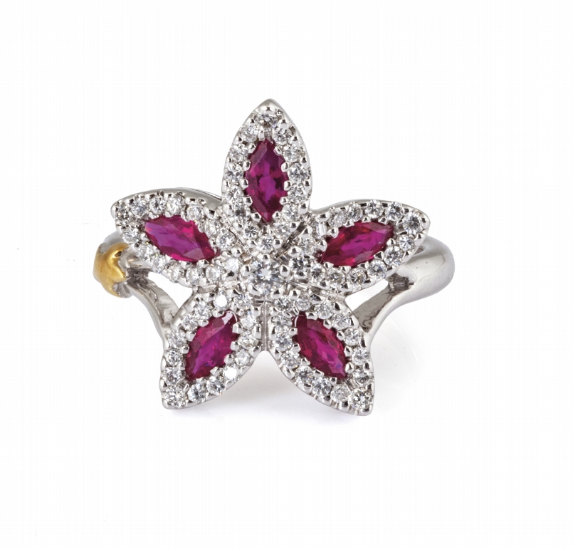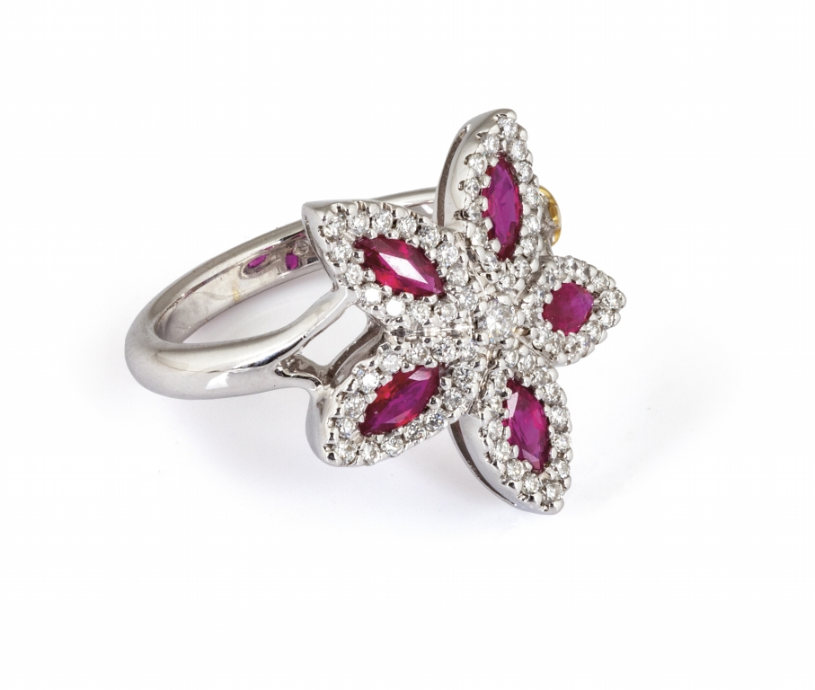 Anello in oro bianco a forma di fiore con incastonati rubini taglio per tot ct 0 80 circa e diamanti naturali taglio brillante per tot ct 0 55 circa