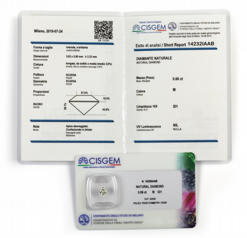 Diamante naturale taglio brillante di ct 0 66 colore M