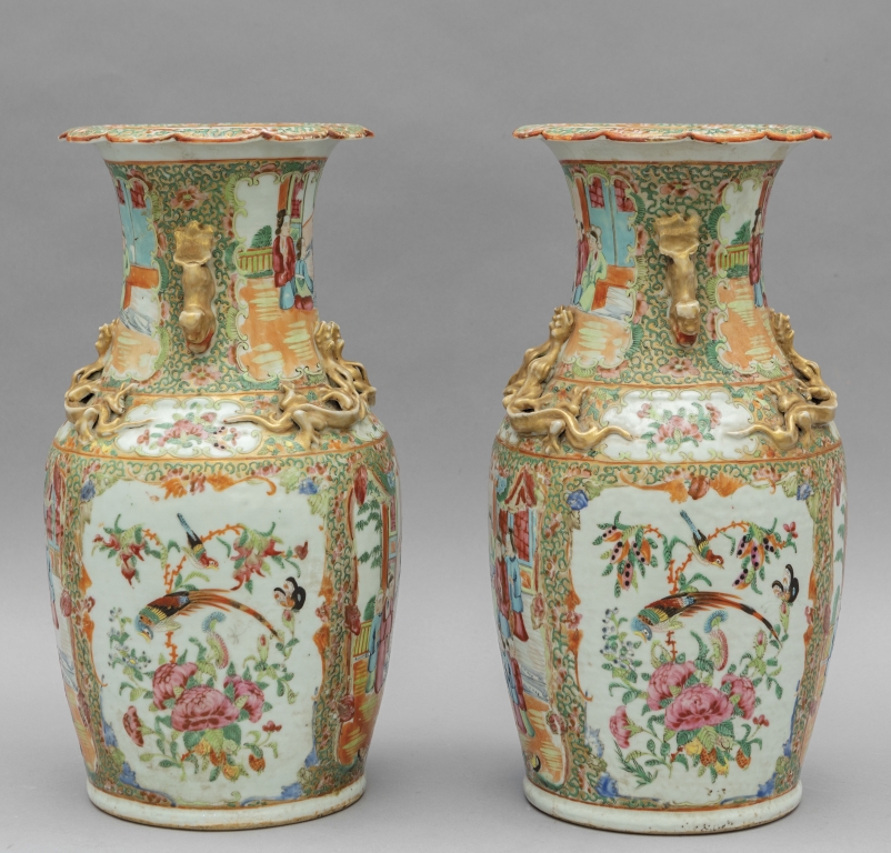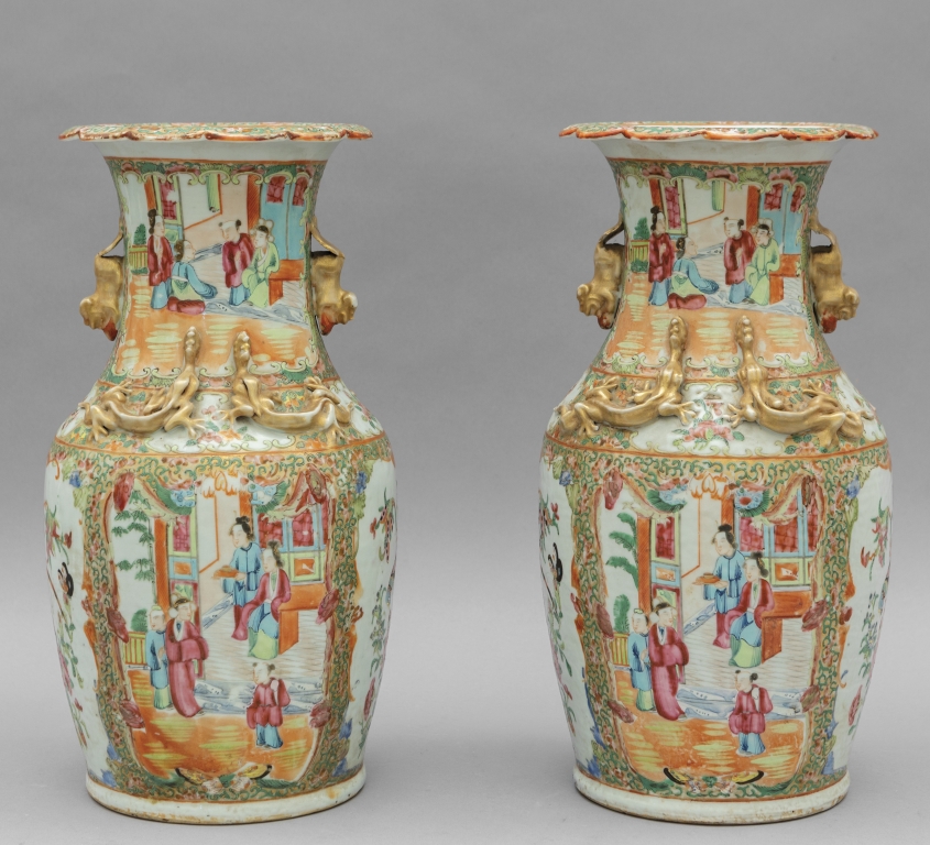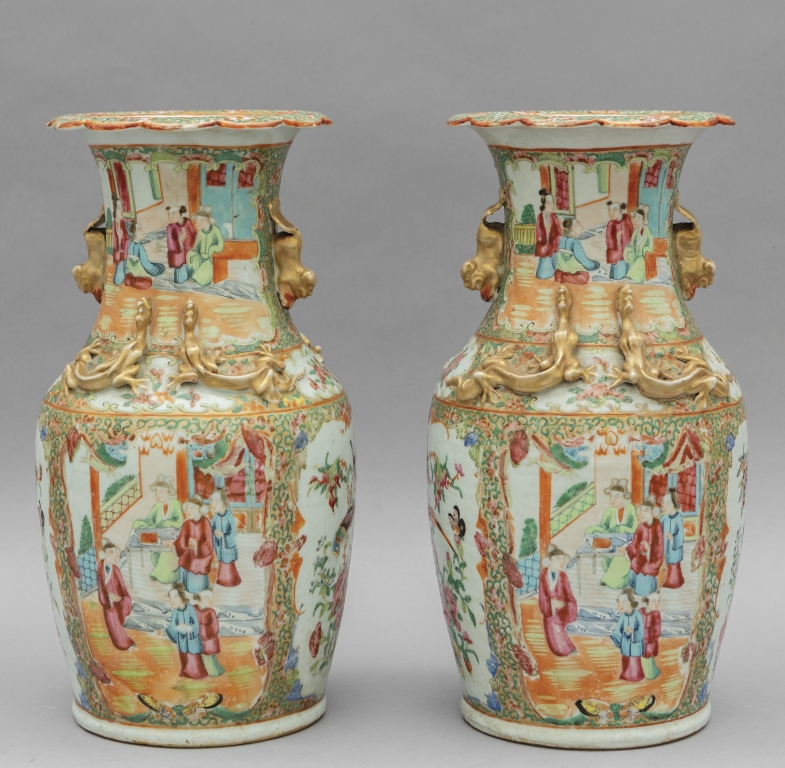 Coppia di vasi in porcellana decorati in policromia con figurine Canton sec.XIX