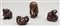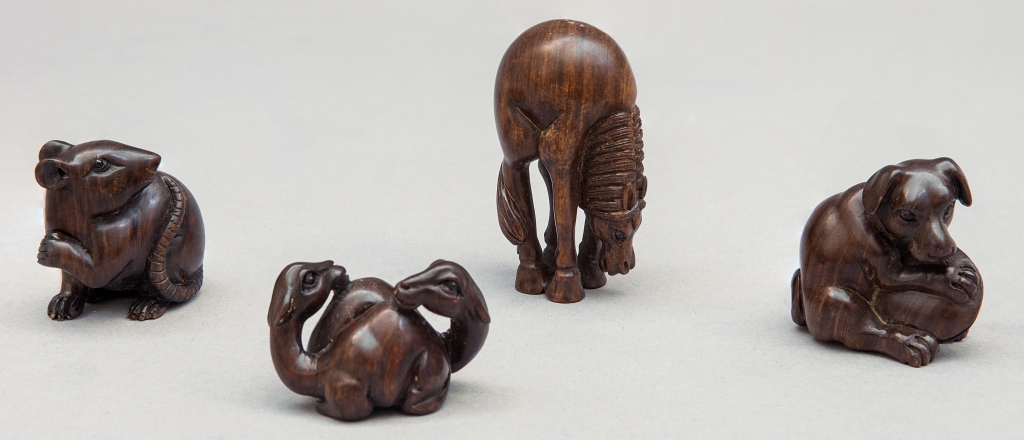 Quattro netzuchè in legno scuro duro intagliato raffiguranti animali (cavalli dromedario cane topo) f.ti alla base Cina sec.XX
