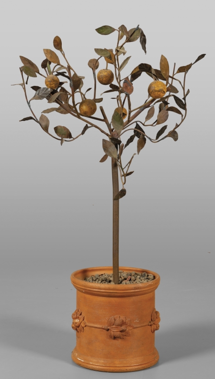 Pianta di limoni in ferro battuto e policromato con vaso in terracotta