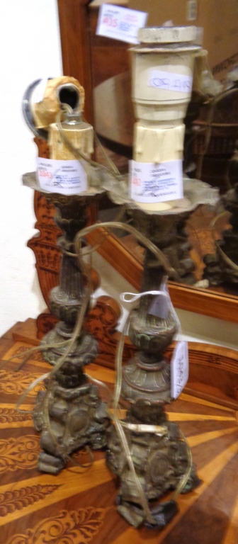 Coppia di candelieri antichi in rame argentato adattati a lampada