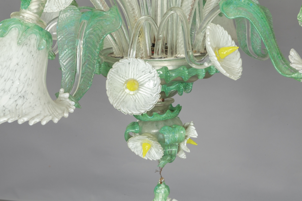 Lampadario in vetro di Murano a sei luci con fiori e foglie bianchi e verdi sec.XX