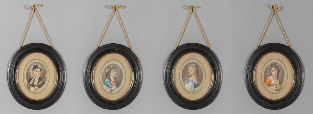 'Le quattro stagioni' quattro stampe ovali acquarellate cornici in legno ebanizzato