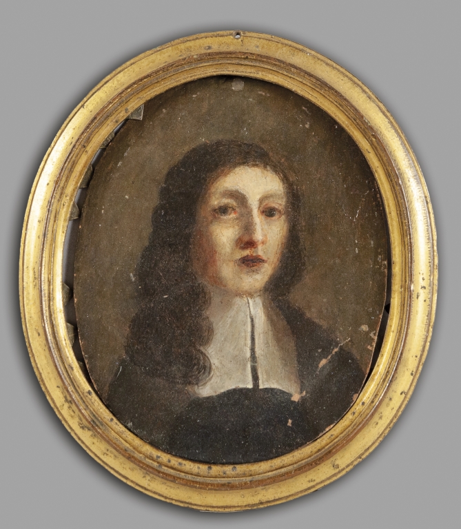 'Ritratto di personaggio con colletto bianco' olio su rame di forma ovale sec.XVIII cornice coeva in bronzo