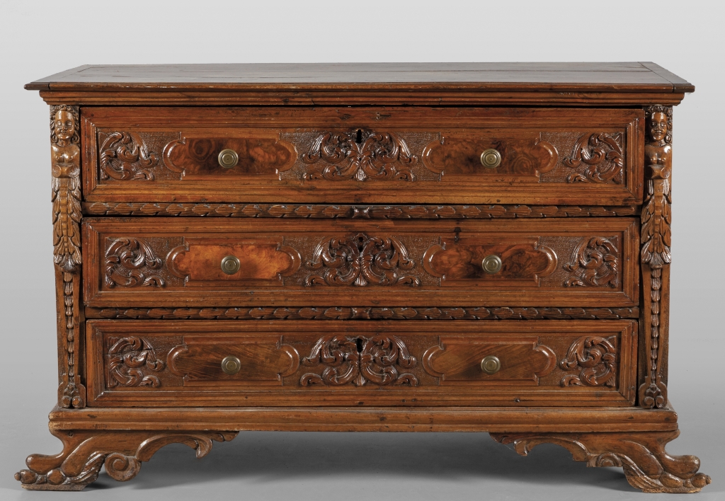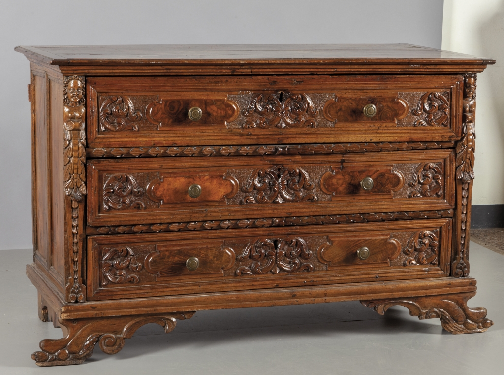 Canterano in noce a tre cassetti intagliato sul fronte montanti con bambocci Bergamo fine sec.XVII