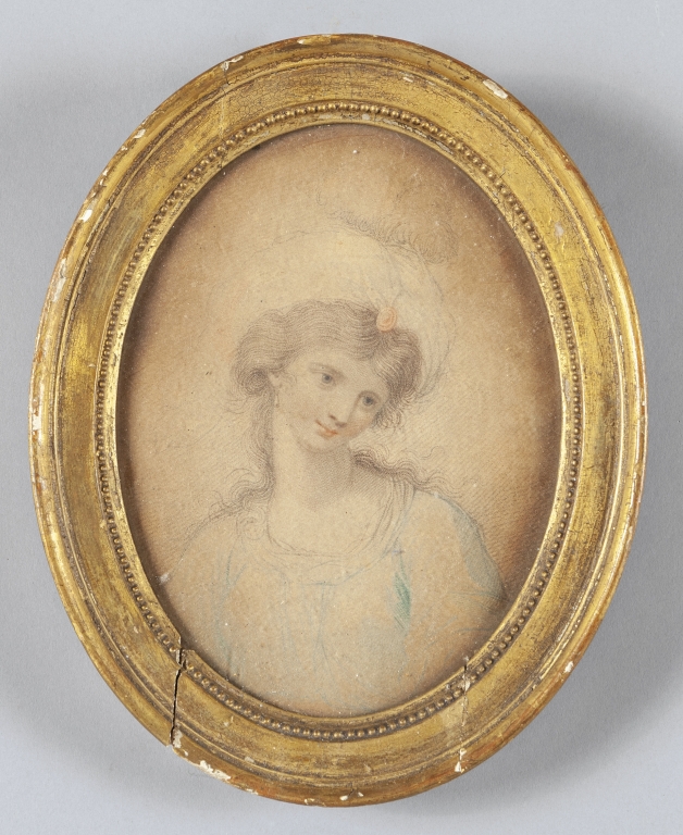 'Giovane ragazza con cappello piumato' acquarello di forma ovale