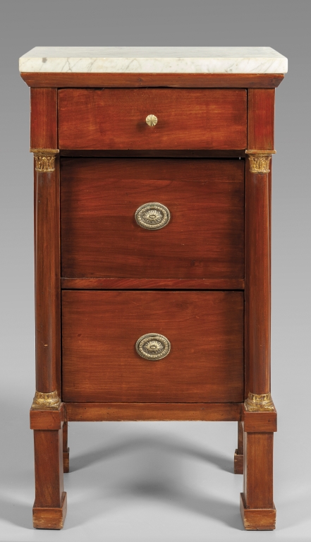 Comodino Impero in mogano a due cassetti più uno sportello piano in marmo Francia sec.XIX